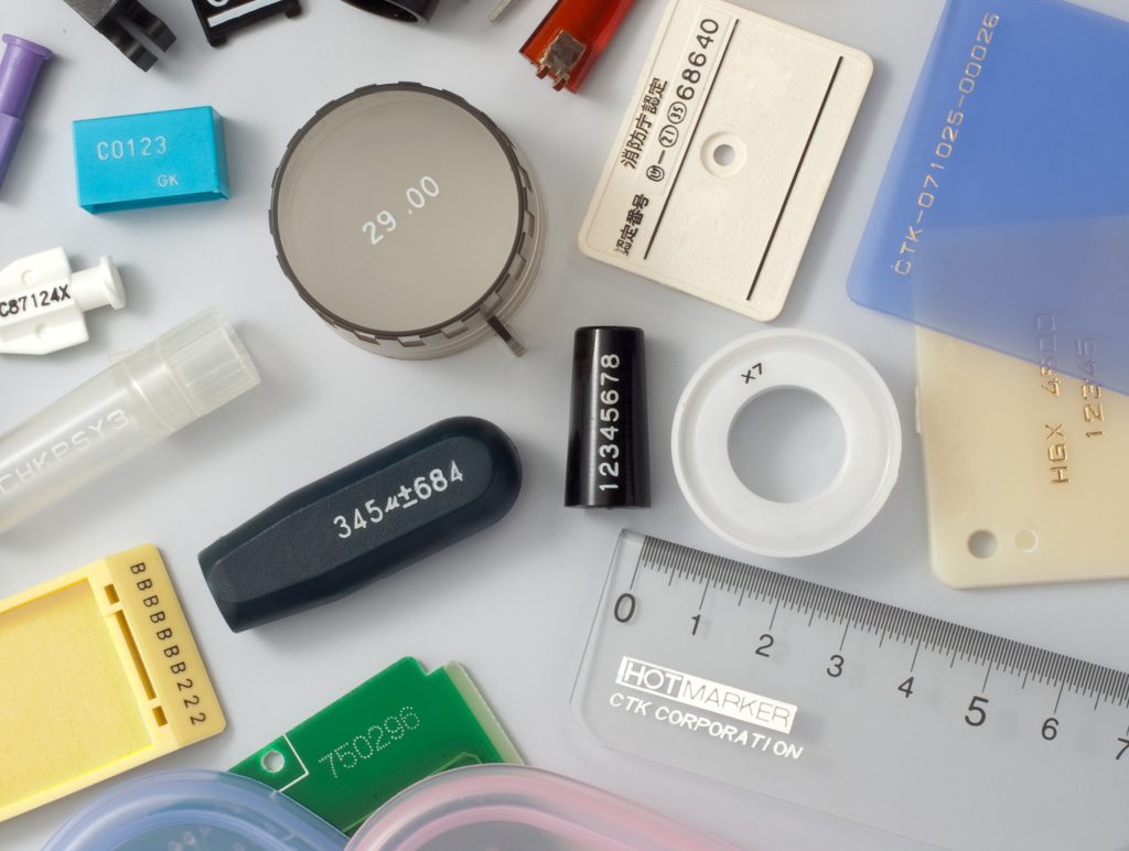 加熱によって変形する樹脂は、ホットスタンプ式印刷機での印刷が可能です。適応できる樹脂の材質は、汎用樹脂からエンプラまで様々です。